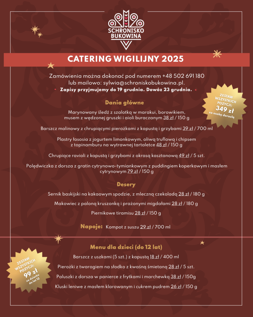 Zamów wigilijne potrawy i ciesz się świątecznym smakiem w domu, wynajmowanym domku lub apartamencie – bez gotowania, za to z prawdziwą atmosferą świąt pod Tatrami!