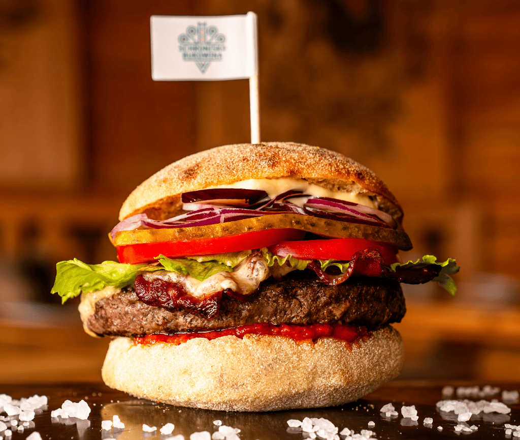 bułka, wołowina Wagyu, ser, boczek, pomidor, pikle, sałata, cebula czerwona, relish, sos aioli