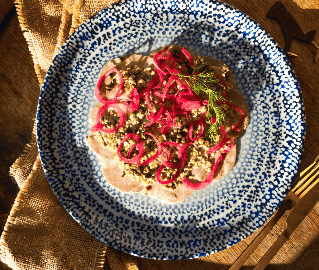 Thin slices of slow-cooked pork neck on horseradish mousse with tartar sauce and pickles
