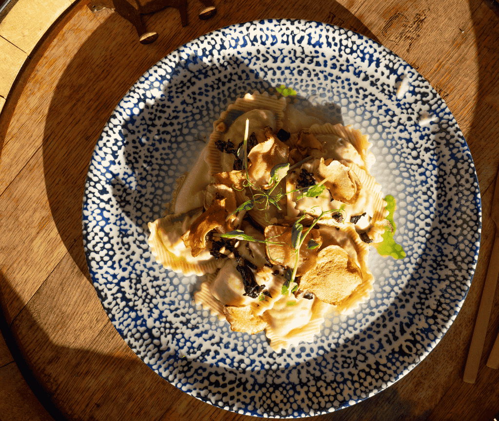 Lamb and black chanterelle dumplings with Jerusalem artichoke puree, roasted hazelnuts, brown butter and bryndza cheese