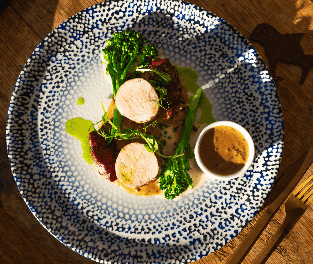 Pork tenderloin with red cabbage, wild broccoli in a butter emulsion and pepper sauce
