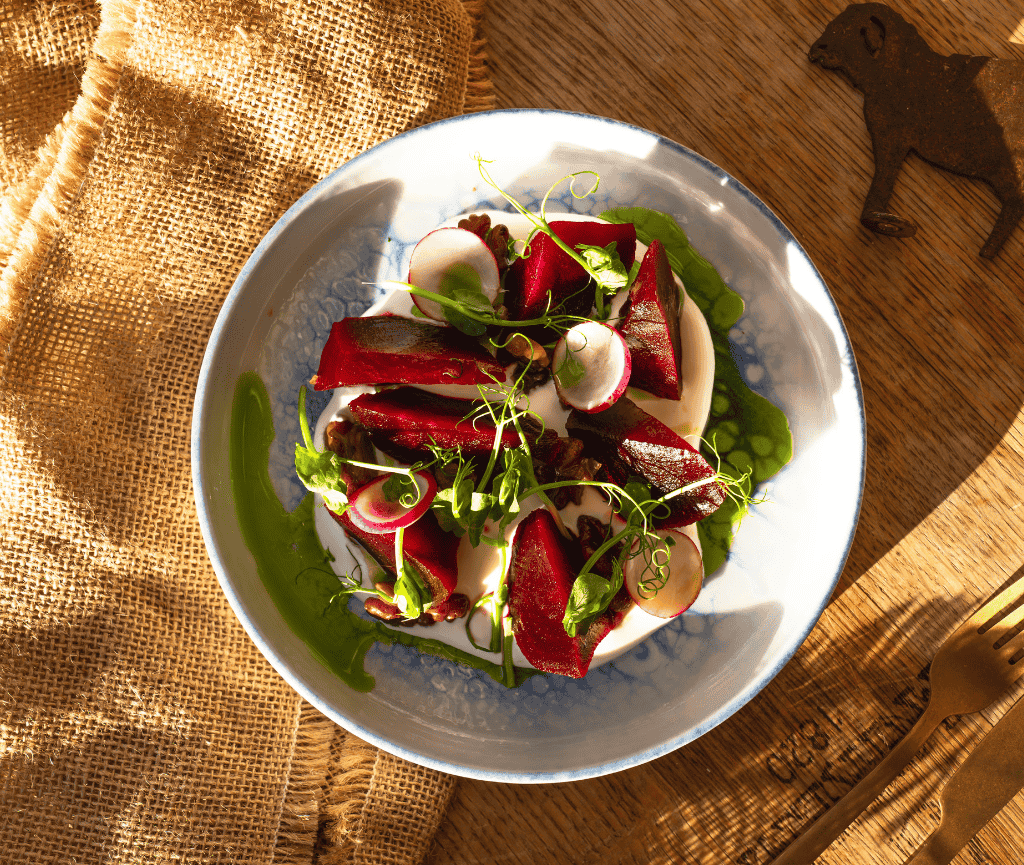 Beetroot with goat cheese, white turnip, cranberries, honeyed walnuts and pumpernickel