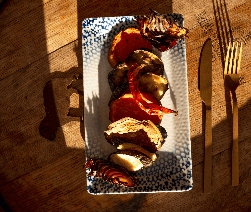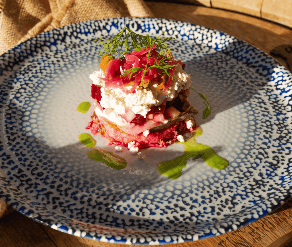 w korzennych przyprawach z kurkami, jabłkiem, pieczonym burakiem i wędzonym twarogiem