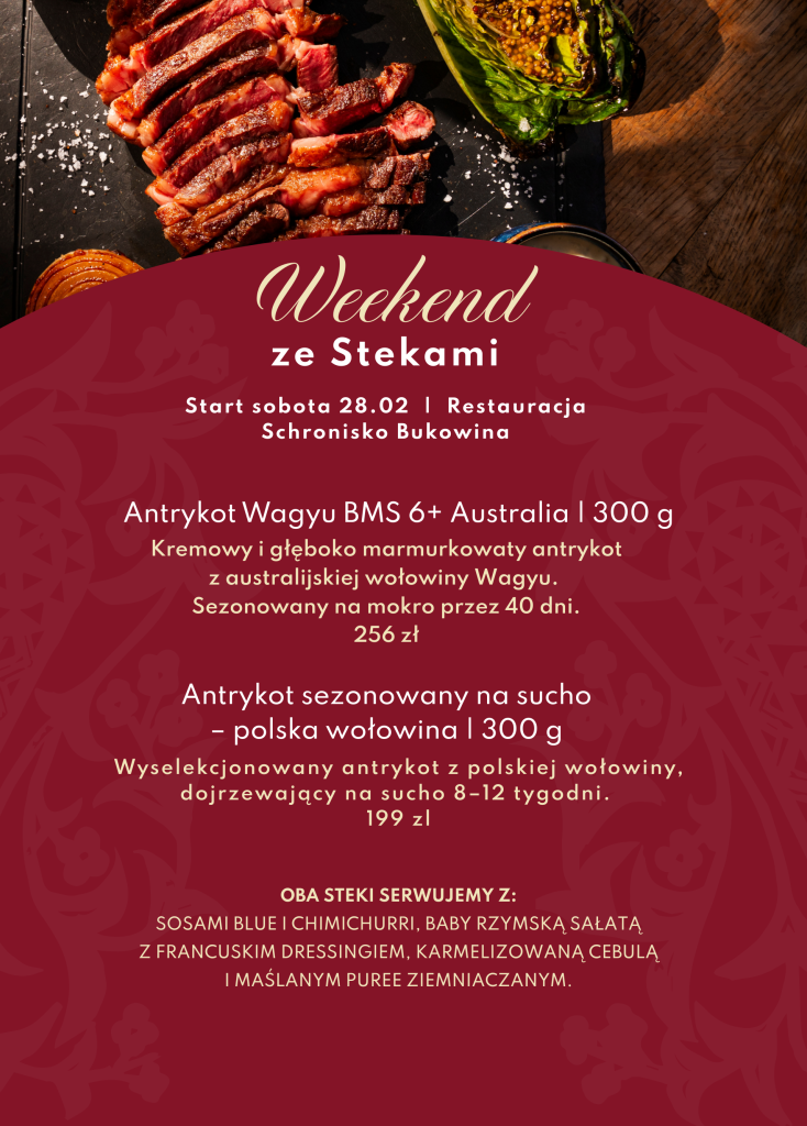 Zapraszamy na wyjątkowy weekend pełen smaków w Schronisku Bukowina! Od 28 lutego rozkoszuj się dwiema niepowtarzalnymi propozycjami steków.